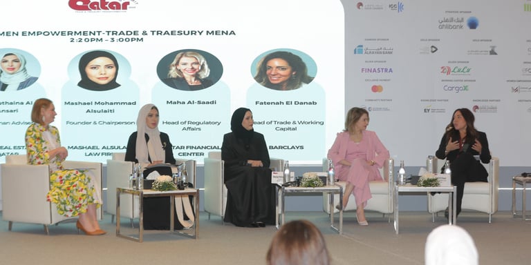Qatar's remarkable journey in women's workforce participation provided compelling context for the ‘Women’s Empowerment – Trade & Treasury MENA’ session, moderated by Eleanor Hill, Content Director, MERGE Events. In 2024, female labour force participation in Qatar reached 63.31% significantly above the global average of 51.07% making it the highest in the Middle East region. The panel featuring Dr. Bothaina Al-Ansari from Just Real Estate Qatar, Mashael Mohammad Al Sulaiti from Mashael Al Sulaiti Law Firm, Maha Al-Saadi from Qatar Financial Centre, and Fatenah El Danab from Barclays Bank, spoke from a position of proven progress.